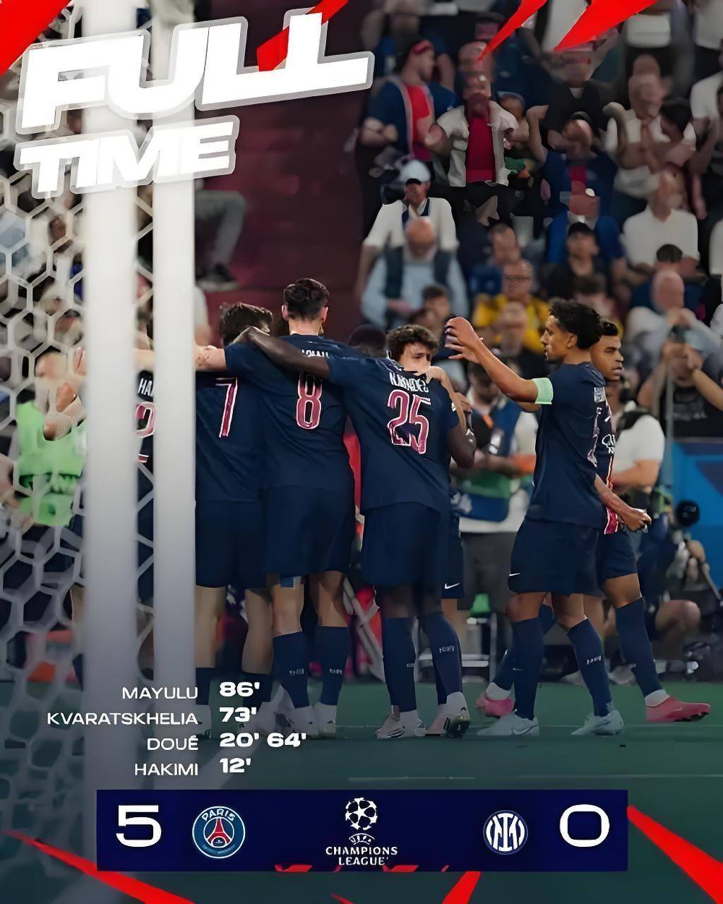 3-0!巴黎圣日耳曼的欧冠梦在这一刻彻底照进现实。最终比分定格在5-0,这个创下欧冠决赛历史最大分差的数字,宣告着欧洲足坛新王朝的诞生。